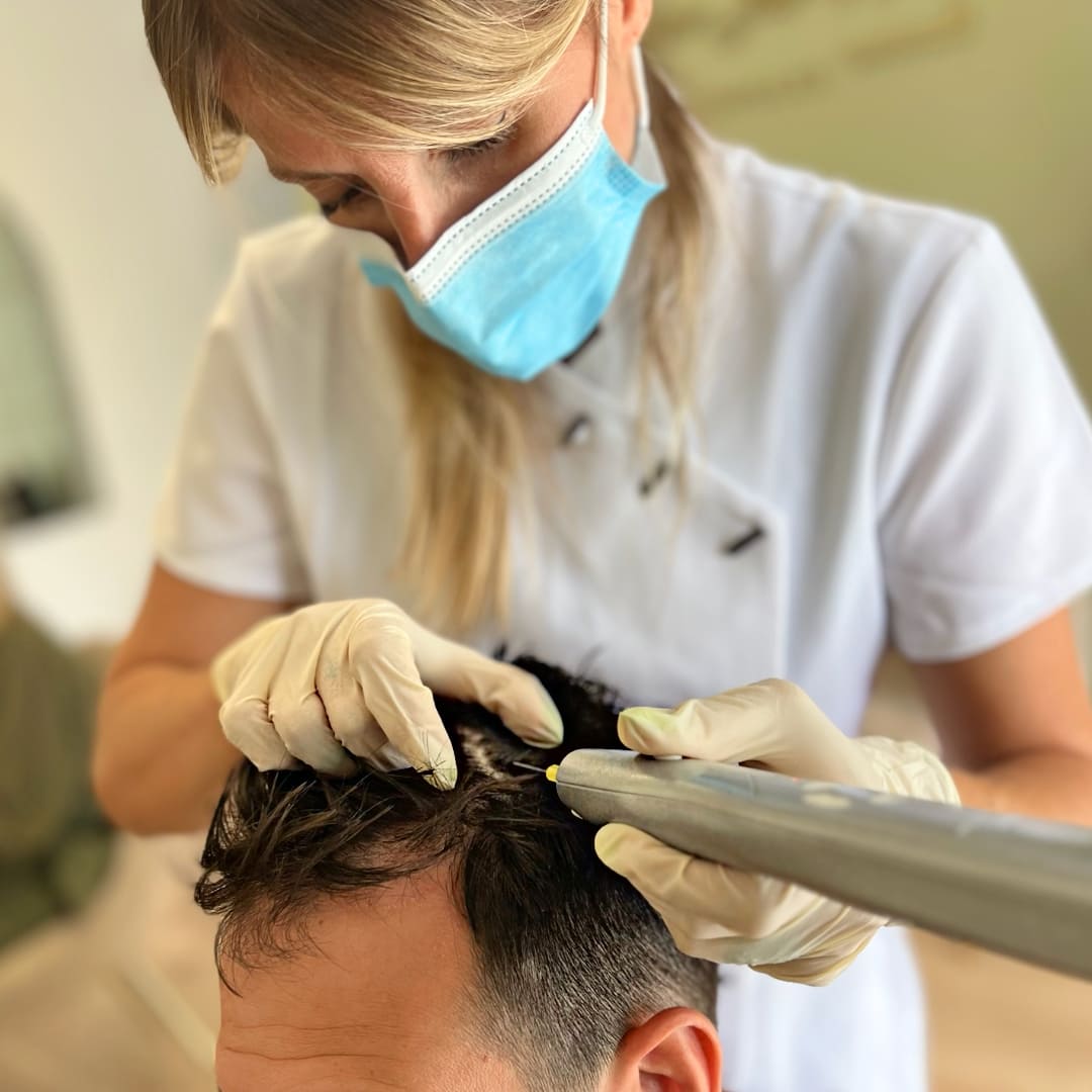 Une évaluation détaillée est réalisée pour déterminer l'état du cuir chevelu et des follicules pileux.